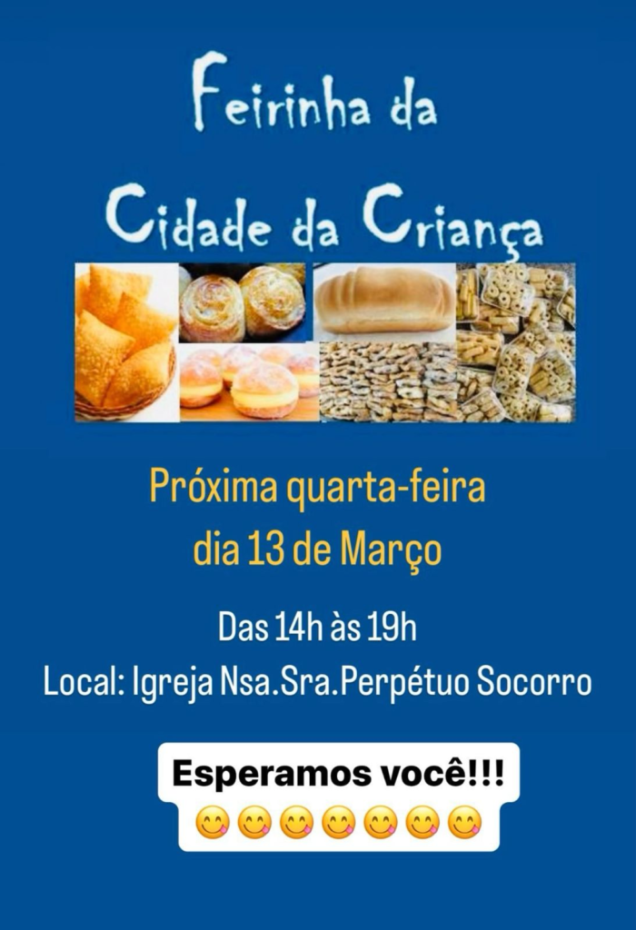 • Feirinha da Cidade da Criança, quarta-feira, das 14 às 19h na Paroquia Nossa Senhora do Perpetuo Socorro. Novidade na Feirinha neste mês é bolo de fubá fofinho com calda de goiabada e biscoitos decorados para a Páscoa