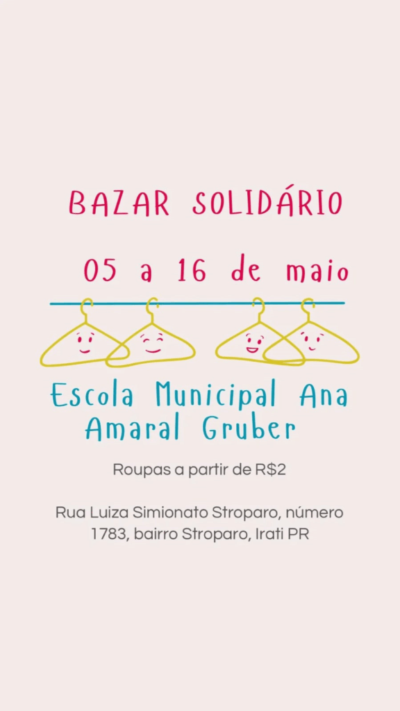 Bazar solidário até o dia 16 de maio, na Escola Ana Amaral Gruber no Bairro Stroparo, das 08h às 11h e das 13h às 16h, com roupas a partir de R$ 2,00