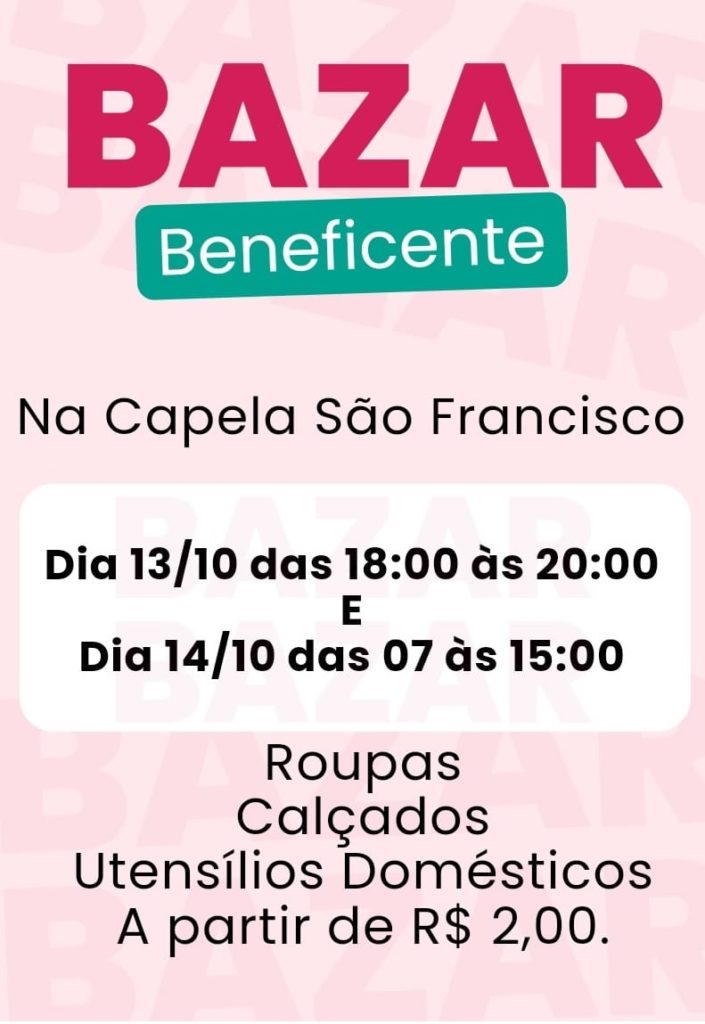 • Bazar beneficente na Capela São Francisco, sexta-feira, dia 13, das 18 às 20h e sábado, dia 14, das 07 às 15h na Capela São Francisco. Haverá roupas, calçados, utensílios domésticos a partir de R$ 2,00