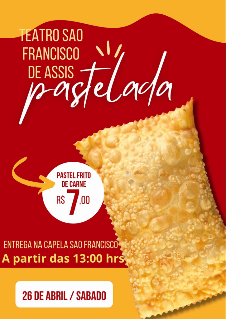 - Teatro São Francisco de Assis promove pastelada dia 26 de abril, a partir das 13h, Pastel frito de carne: R$ 7,00 – Entrega na Capela São Francisco