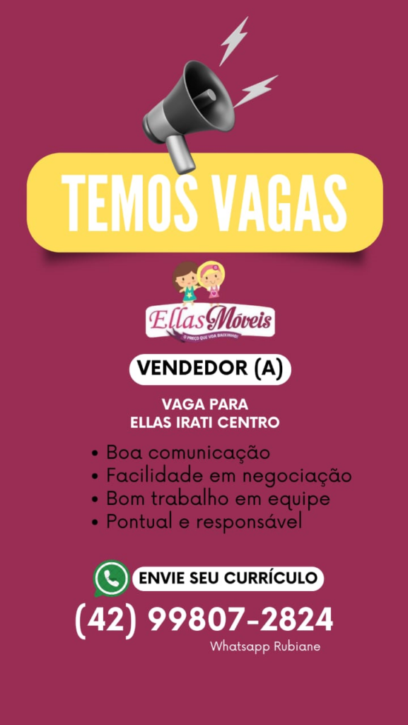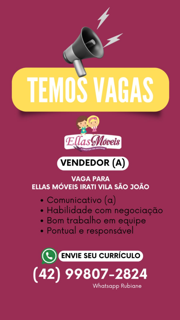 • ELLAS MÓVEIS está contratado vendedor(a) para as Lojas da Vicente Machado e Vila São João. Interessados enviar curriculo 9.9807-2824