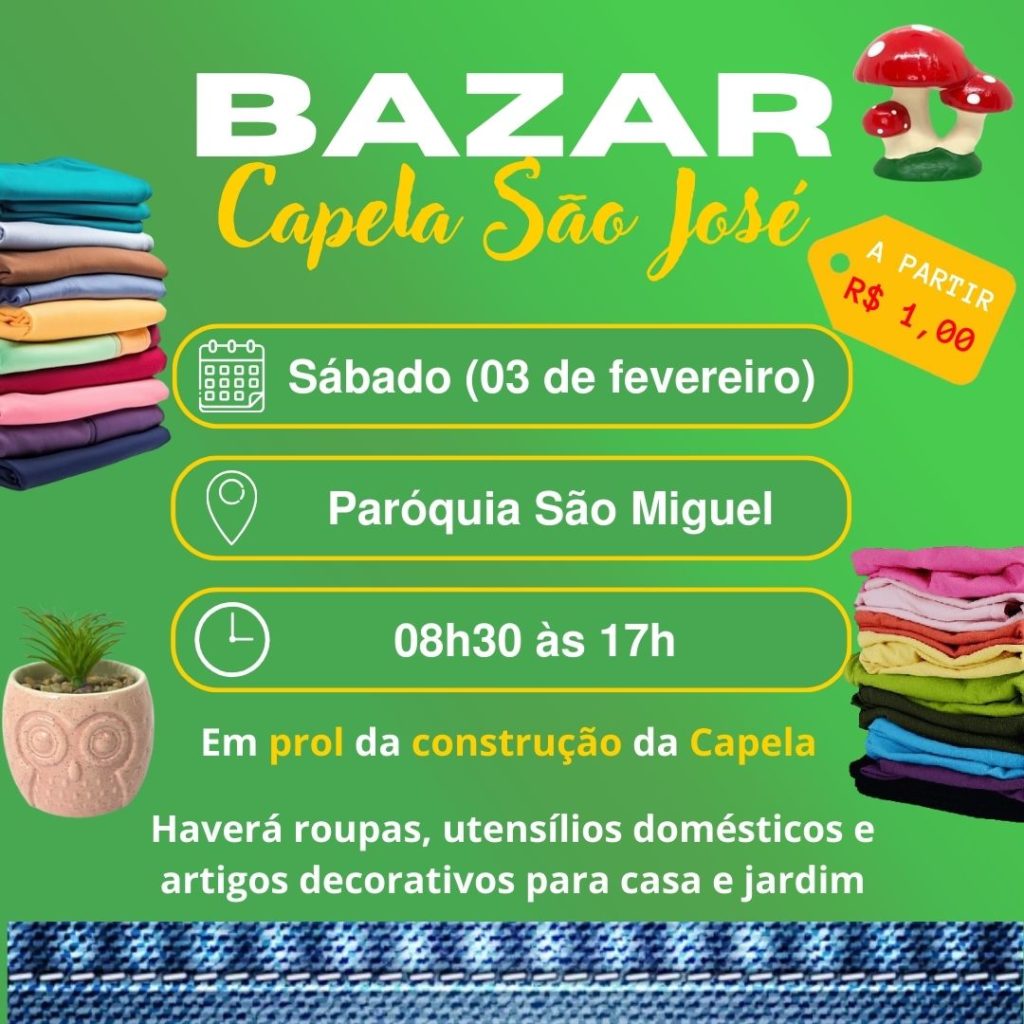 • Bazar dia 03 de fevereiro, no Pavilhão da Paróquia São Miguel, no horário das 08h30 às 17h00, em prol da construção da Capela São José. Haverá roupas, utensílios domésticos e artigos decorativos para casa e jardim.