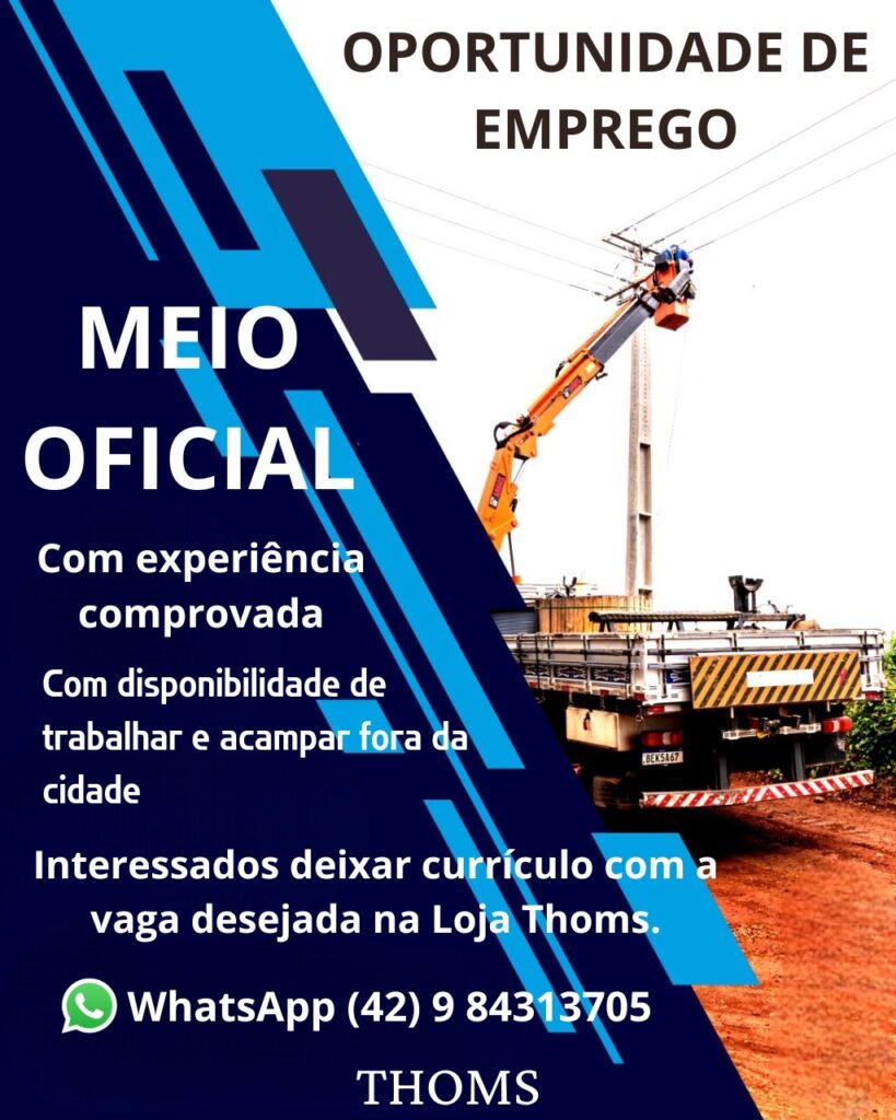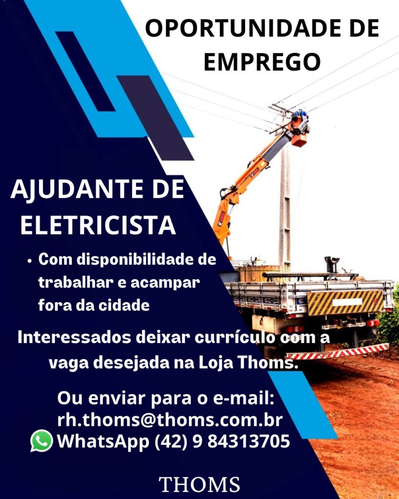 Precisa-se de ajudante de eletricista e meio oficial, disponibilidade de trabalhar e acampar fora da cidade. Interessados deixar currículo com a vaga desejada na Loja Thoms – whats 9.8431.3705