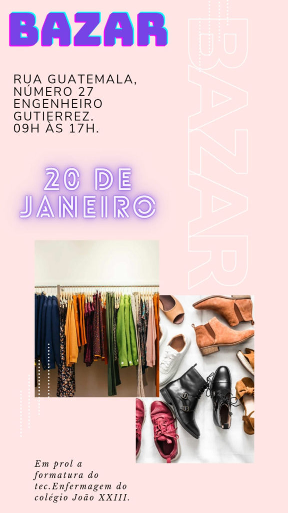 • Bazar dia 20 de Janeiro, na Rua Guatemala, 27 – Engenheiro Gutierrez, no horário das 9 às 17h. O lucro será em prol da formatura do Curso Técnico de Enfermagem do Colégio João XXIII.