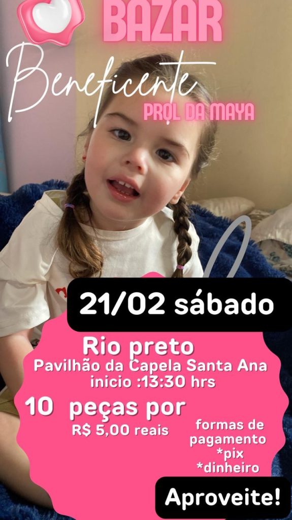 • Bazar beneficente em prol da Maya, dia 21 de fevereiro, em Rio Preto no Pavilhão da Capela Santa Ana com inicio as 13h30 – 10 peças por R$ 5,00