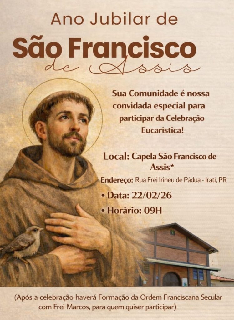 • Ano Jubilar de São Francisco de Assis, domingo, às 09h na Capela São Francisco. Após a celebração haverá Formação da Ordem Francisca Secular com Frei Marcos, para quem quiser participar.