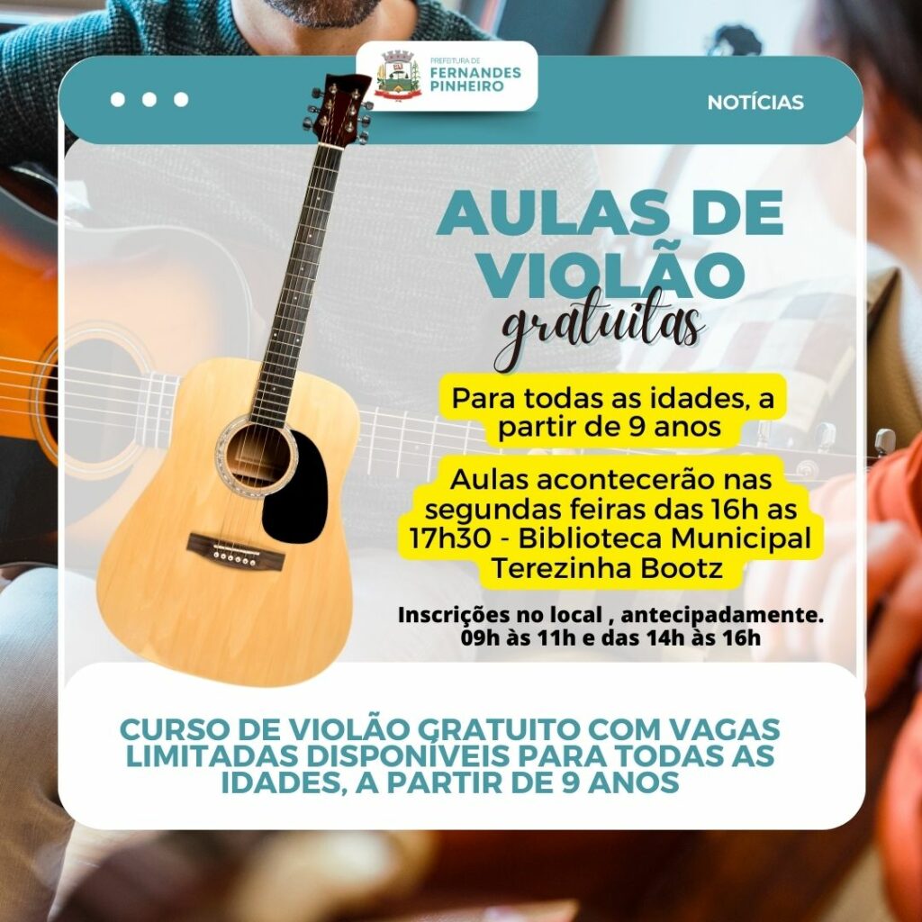 • Aulas de violão gratuitas para todas as idades, a partir de 9 anos. As aulas acontecerão as segundas-feiras das 16h00 às 17h30 na Biblioteca Municipal em Fernandes Pinheiro. Inscrições no local