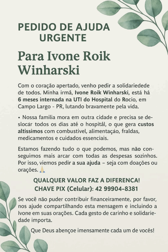 • A irmã de Ismael Roik, Ivone Roik Winharski, está lutando pela vida na UTI do Hospital do Rocio em Campo Largo há 6 meses. A família precisa de ajuda para custear as despesas diárias, incluindo combustível, alimentação, fraldas, medicamentos e cuidados essenciais. Se você puder ajudar, por favor, entre em contato 9.9825-9421 ou faça uma doação via Pix: 42 9.9904-8381. Qualquer valor faz diferença!