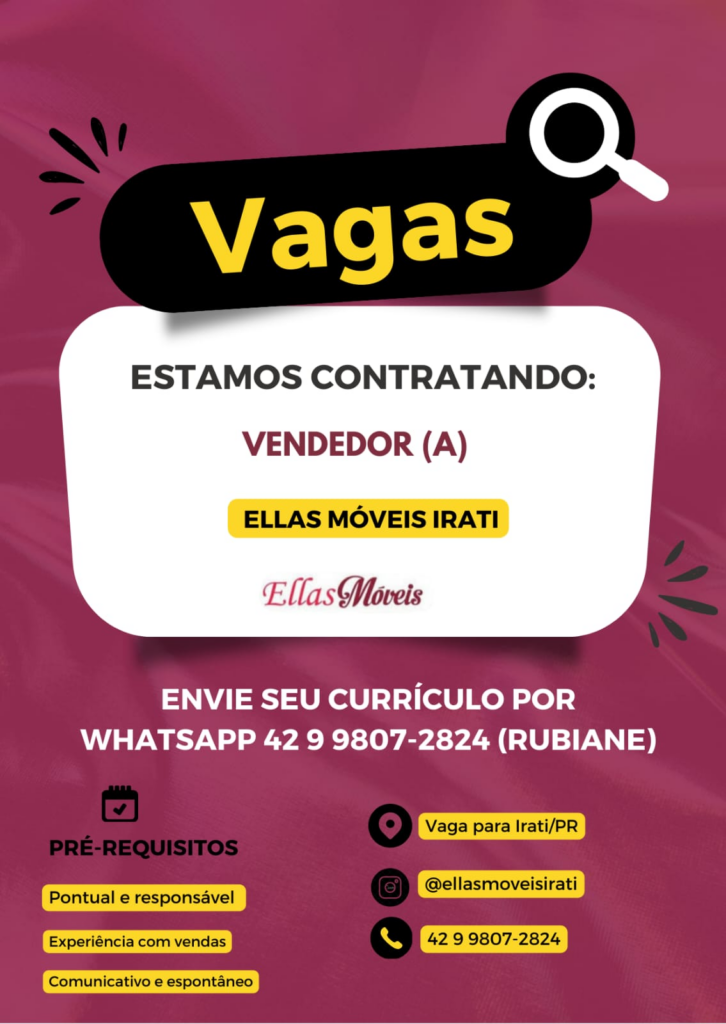 • Ellas Moveis está contratando vendedor com experiência, que seja comunicativo, espontâneo, pontual e responsável. Interessados enviar curriculo para Rubiane no whats (42) 9.9807-2824
