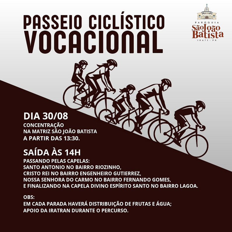 • Passeio ciclístico vocacional, sábado, dia 30. Concentração a partir das 13h30 na concentração na Matriz São João Batista. Saída 14h passando pelas capelas Santo Antonio em Riozinho, Cristo Rei em Engenheiro Gutierrez, Nossa Senhora do Carmo no Fernando Gomes, finalizando na Capela Divino Espirito Santo no Bairro Lagoa. Em cada parada haverá distribuição de frutas e água. Apoio da Iratran durante o percurso