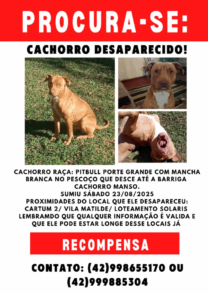 • Desapareceu sábado das proximidades do Cartoon 2, um cachorro Pitbull, manso, porte grande, caramelo com mancha branca do pescoço até a barriga. Atende por Clyde. Oferece recompensa. Contato 9.9865-5170 ou 9.9988-5304