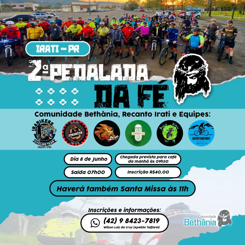 • Comunidade Bethania, Recanto Irati e Equipes promovem 2ª Pedalada da Fé, dia 08 de junho. Saída as 07h com chegada prevista às 09h30 para café da manhã. Inscrição R$ 40,00 – às 11h00 haverá missa. Informações e inscrições 9.8423-7819