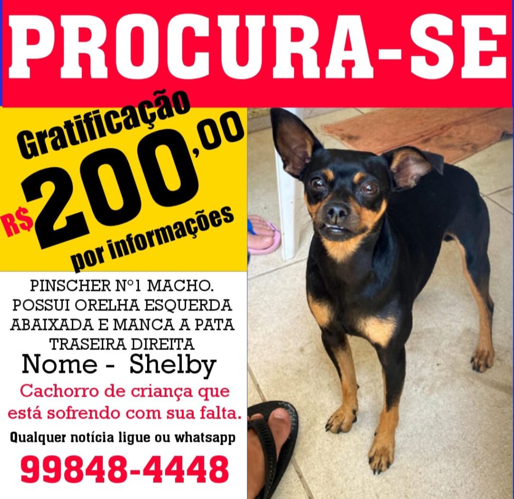 Desapareceu das proximidades do Morro da Santa um cachorro pinscher nº 1, preto com caramelo com a orelha esquerda abaixada. É de uma criança que está desesperada pela falta dele. Gratifica-se: R$ 200,00. Contato: 9.9848-4448.