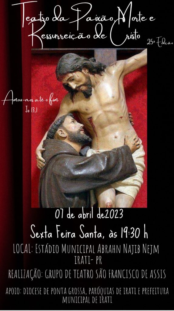 Domingo, dia 29, às 19h, reunião de organização do 25º Teatro da Paixão de Irati, para membros da Diretoria e todos os integrantes do Grupo, no Centro Pastoral da Capela São Francisco de Assis.
