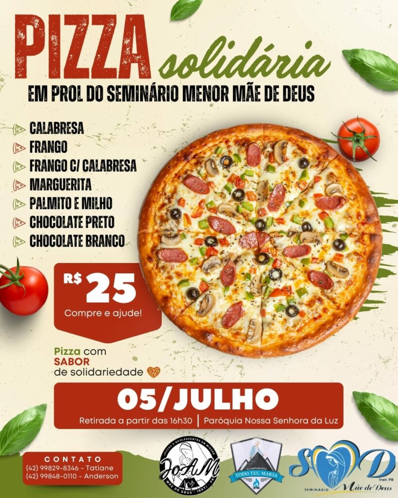 • Pizza solidária em prol do Seminário Menor Mãe de Deus, dia 05 de julho, a partir das 16h30 na Paróquia Nossa Senhora da Luz. Preço R$ 25,00 – Contato Tatiane 9.9829-8346 e Anderson 9.9848-0110