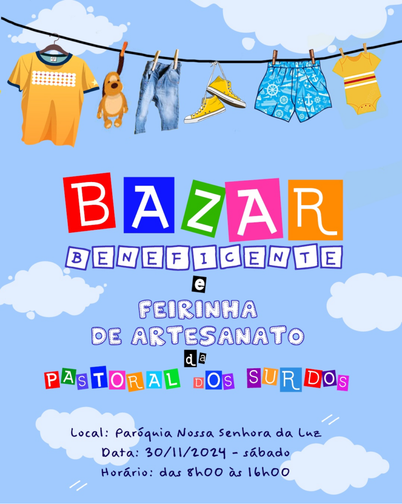 • Bazar beneficente e Feirinha de Artesanato da Pastoral dos Surdos, sábado, das 08 às 16h na Paróquia Nossa Senhora da Luz