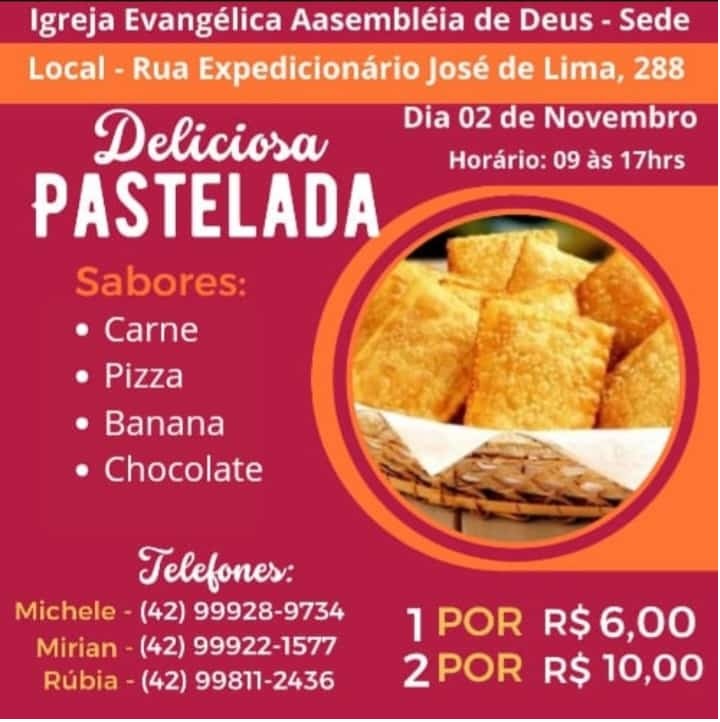• Quinta-feira, dia 02, pastelada na Igreja Assembleia de Deus – Sede à Rua Expedicionário José Lima, 288 das 09 às 17h. Venda de pastel de: carne, pizza, banana e chocolate.