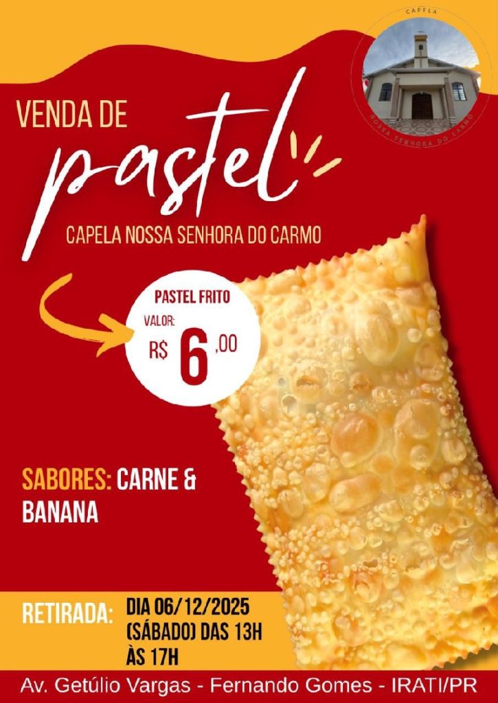 • Pastelada na Capela Nossa Senhora do Carmo na Avenida Getúlio Vargas – Conjunto Fernando Gomes, sábado, das 13 as 17h – Pastel de carne ou banana por apenas R$ 6,00 cada. Toda renda será destinada a melhoria da capela