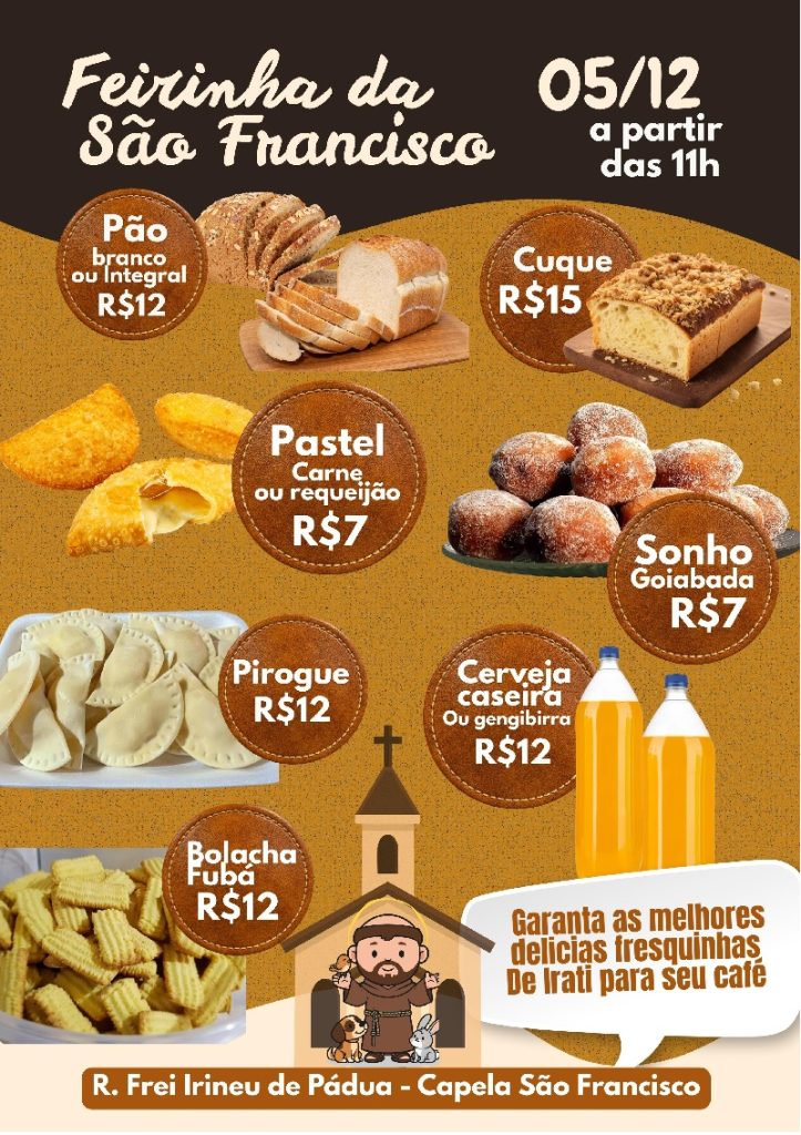 • Feirinha de São Francisco, última do ano, na Capela São Francisco, sexta-feira, a partir das 11h – Venda de pão branco ou integral, cuque, paste de carne e requeijão, sonho de goiabada, pirogue, cerveja caseira ou gengibirra, bolacha de fubá.