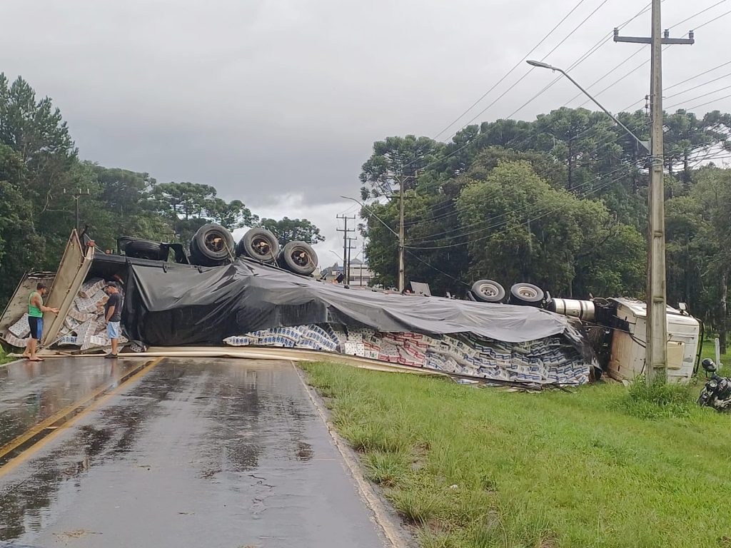 O primeiro deles foi registrado por volta das 15h de sábado, no km 1 da rodovia. O acidente foi do tipo tombamento e envolveu um caminhão Scania com placas de Londrina, carregado com rolos de papel higiênico. De acordo com informações preliminares da PRF, uma pessoa sofreu ferimentos leves, sem registro de vítimas graves ou óbitos. Em razão do tombamento, houve interdição total da pista para o atendimento da ocorrência, remoção do veículo e limpeza da via. O trânsito foi totalmente liberado às 22h53.