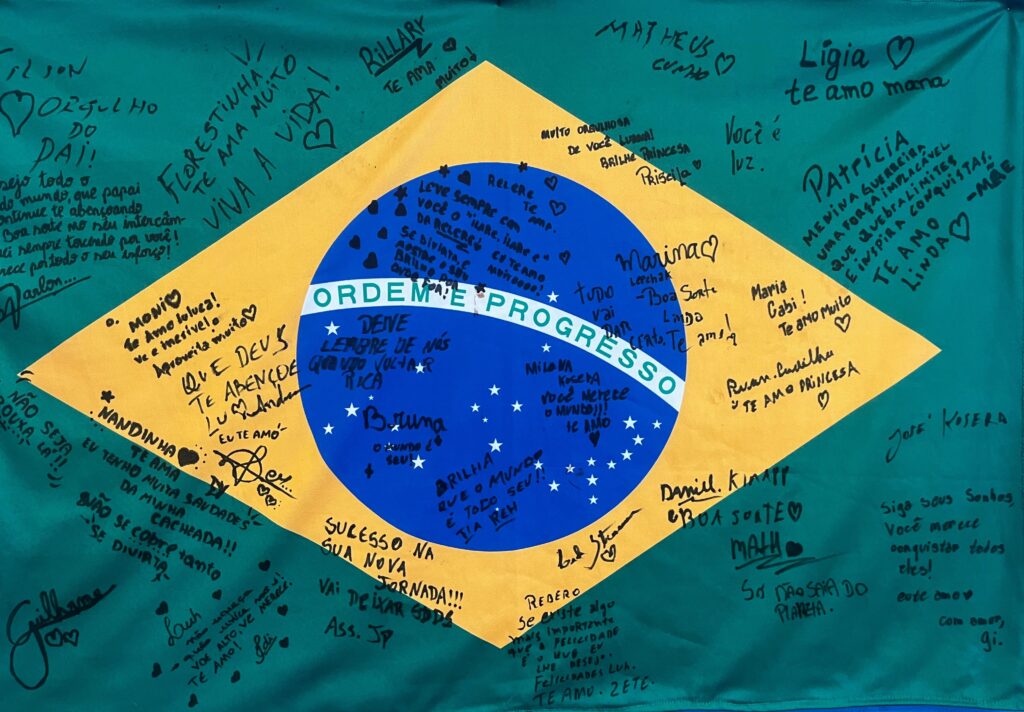 Luana levou para a Nova Zelândia uma bandeira do Brasil com mensagens de amigos e familiares. Foto: Lenon Diego Gauron