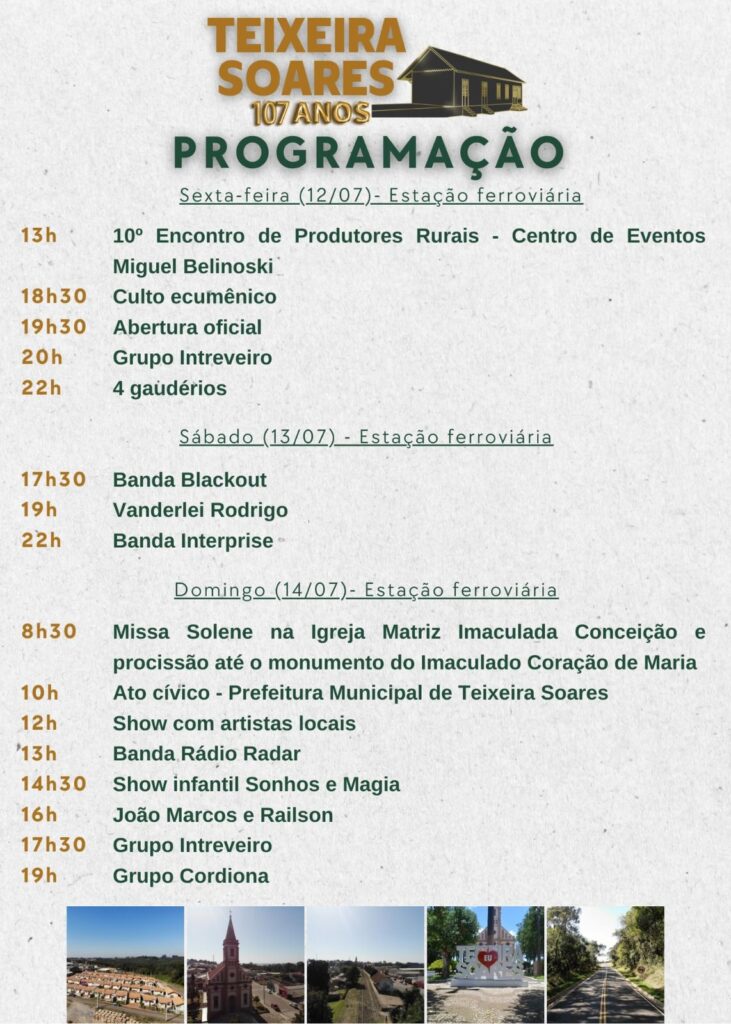 Domingo (14): No dia do aniversário de Teixeira Soares, domingo (14), a programação festiva tem início às 8h30, com missa solene na Igreja Matriz Imaculada Conceição, seguida de procissão até o monumento Imaculado Coração de Maria, na Praça Irmãos Baumel. A procissão será acompanhada pela Banda Municipal Guarany. Às 10h, haverá um Ato Cívico em frente à Prefeitura de Teixeira Soares, com hasteamento das bandeiras.