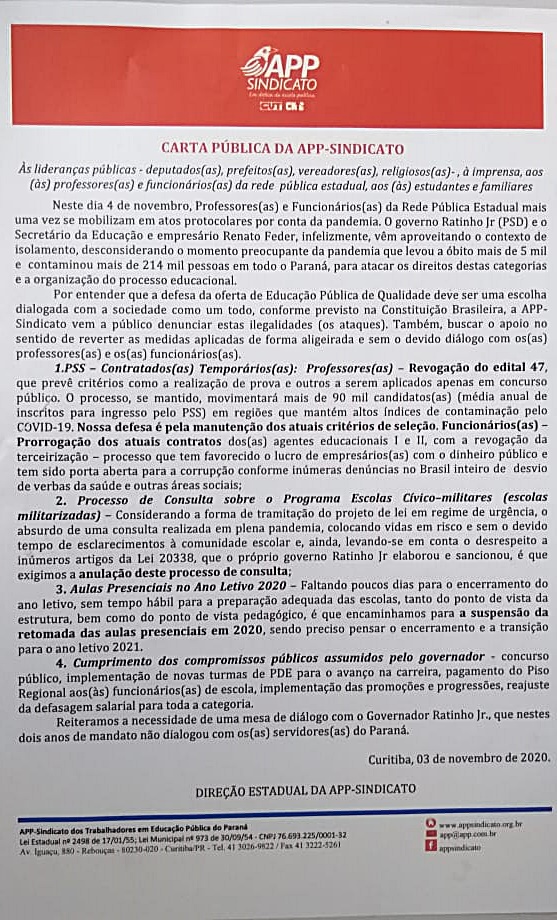 A APP-Sindicato, que representa os professores e funcionários das escolas públicas do Paraná, apresentou uma carta pública na qual faz críticas às medidas adotadas recentemente pelo Governo do Paraná na área da educação.