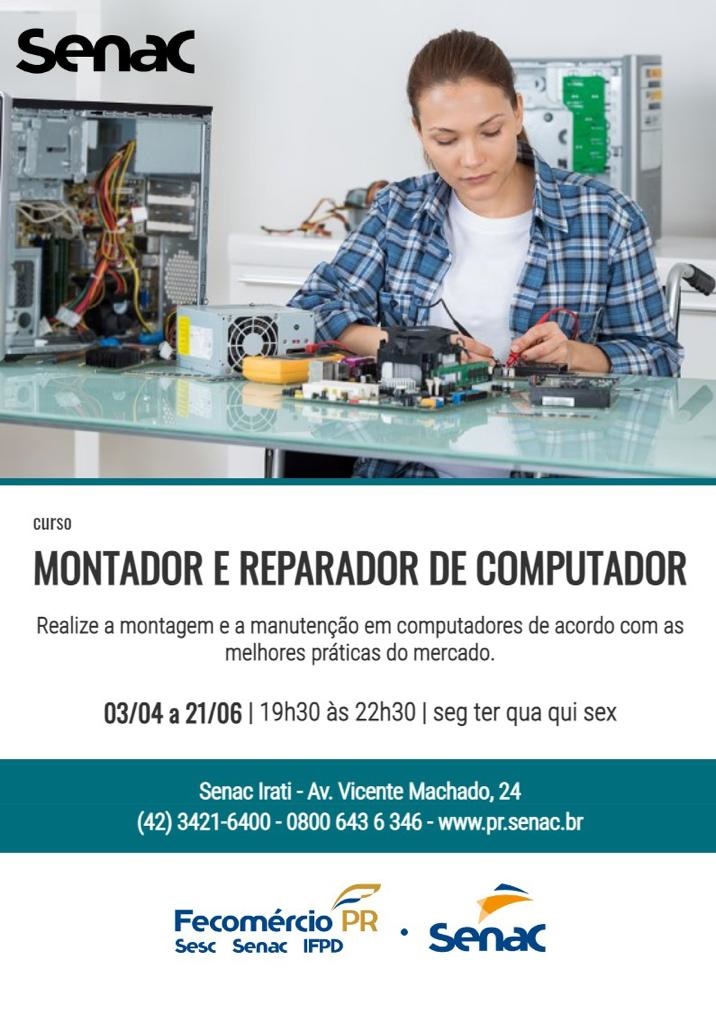 O único curso que ainda dispõe de vagas é o de montador e reparador de computador. Ele será iniciado no dia 3 de abril e segue até o dia 21 de junho, com aulas de segunda a sexta-feira, das 19h30 às 22h30. O curso será realizado no CEU das Artes, que fica no conjunto Joaquim Zarpellon, onde as pessoas podem realizar a inscrição. A idade mínima para participar é 15 anos. Mais informações no SENAC de Irati, que fica na Avenida Vicente Machado, número 24. Telefone para contato 3421-6400.