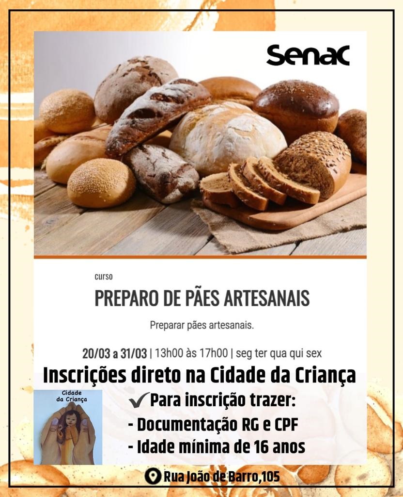 O primeiro que será realizado é o de preparo de pães artesanais. As aulas acontecerão a partir de segunda-feira, dia 20, e seguem até o dia 31 de março (sexta-feira). O horário das atividades será das 13 às 17 h. O curso acontecerá na Cidade da Criança, na rua João de Barro, número 105, no bairro Alto da Lagoa. Segundo o Técnico de Relações com o Mercado do SENAC, Denilson Alessi, as inscrições para esse curso já foram finalizadas e algumas pessoas estão aguardando na fila de espera.