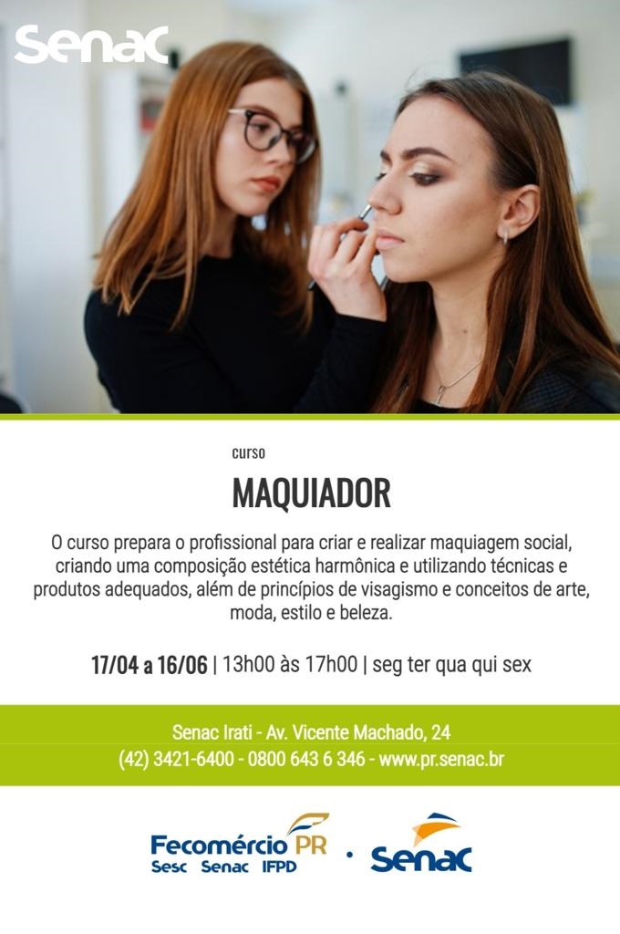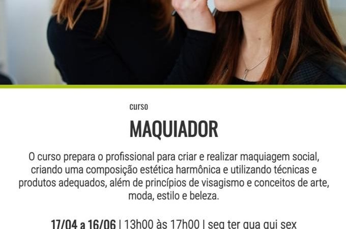 Outro curso com grande procura foi o de maquiador, que também não tem mais vagas disponíveis. Durante as aulas, o profissional aprenderá a realizar uma maquiagem social, com composição estética harmônica e utilizando técnicas e produtos adequados. A pessoa também terá a oportunidade de conhecer conceitos de arte, estilo, moda, beleza e do visagismo (que é uma técnica que trabalha com a análise facial para enfatizar a beleza própria de cada rosto). O curso de maquiador será de 17 de abril a 16 de junho e terá uma carga horária de 160 horas. As atividades serão realizadas de segunda a sexta-feira, das 13h às 17h.