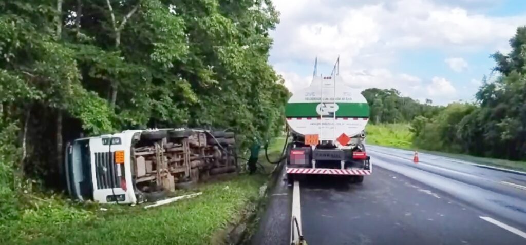 Durante o dia, uma empresa especializada em combustíveis realizou várias análises de segurança. O transbordo da carga do caminhão demorou algumas horas e se estendeu até o período da noite.
