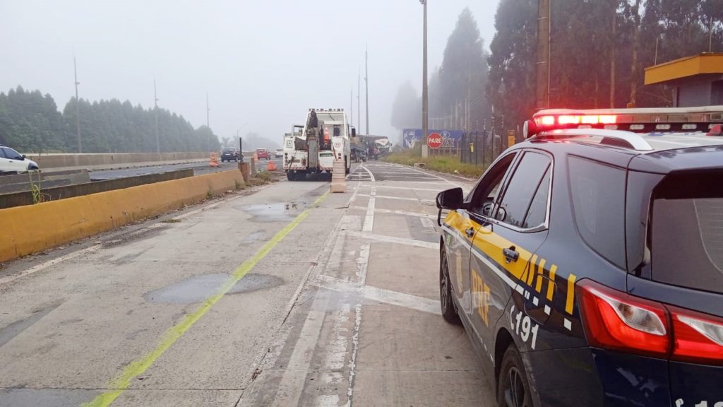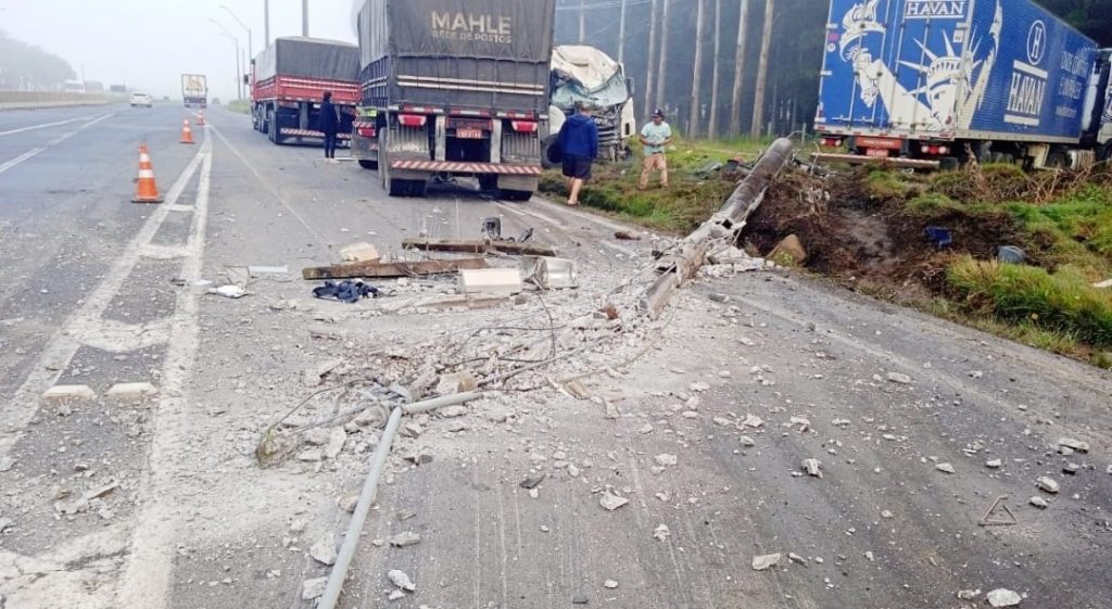 Um caminhão atingiu a estrutura da praça de pedágio desativada na BR-376, na Colônia Witmarsum, em Palmeira, na manhã de hoje. Segundo a Polícia Rodoviária Federal (PRF), o condutor perdeu o controle da direção no quilômetro 538 da rodovia. Com o impacto, o poste caiu e atingiu a lateral de um caminhão da empresa Havan, que bateu no para-choque dianteiro de um outro caminhão Mercedes Azul.
