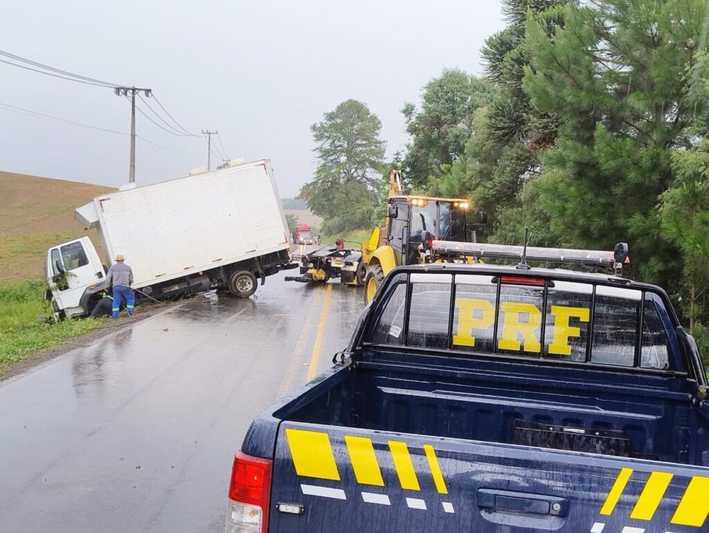 No início da tarde de ontem, a Polícia Rodoviária Federal (PRF) interditou a rodovia parcialmente para retirada do caminhão emplacado em Presidente Castelo Branco/SC. Até que a rodovia fosse liberada, o trânsito seguiu no sistema pare e siga.