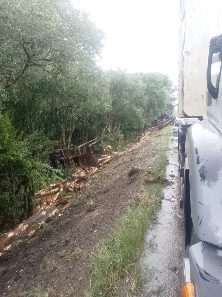 Um caminhão Scania com dois semirreboques tombou na BR-153, em Rebouças, nas proximidades da ponte sobre o Rio Potinga, na tarde desta sexta-feira, por volta das 14h20. O veículo estava carregado com madeiras.