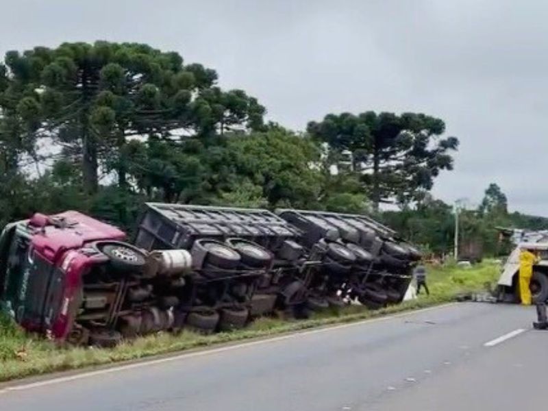 Um caminhão tombou na BR-277, em Guarapuava, na manhã desta quinta-feira, por volta das 6 h. O motorista perdeu o controle da direção no quilômetro 320 da rodovia, no sentido Curitiba. O condutor, de 28 anos, não se feriu. Ele estava transportando soja em grãos com destino ao município de Ponta Grossa.
