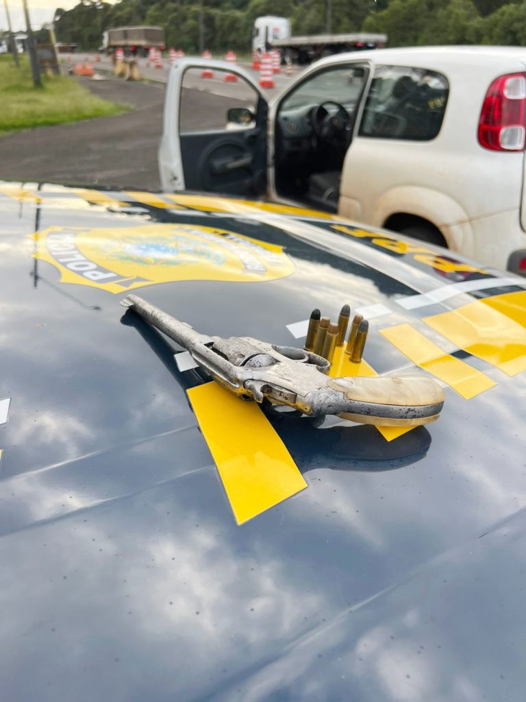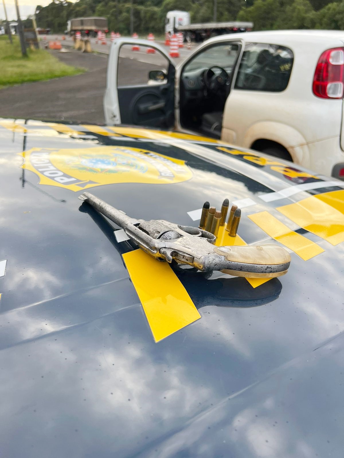 Apreensão de arma e munições: Na BR-277, em Guarapuava, a PRF apreendeu uma arma e munições na tarde de ontem. Os policiais abordaram um veículo Fiat Uno, de Navegantes/SC, no quilômetro 319 da rodovia. Um revólver calibre 380 e seis munições do mesmo calibre foram encontrados no carro. Segundo a PRF, a arma estava sendo transportada no compartimento da caixa de filtro de ar do veículo. O condutor, de 31 anos, seguia de Quedas de Iguaçu/PR para Navegantes/SC. O homem foi detido e encaminhado para a Delegacia de Guarapuava, assim como a arma e as munições.