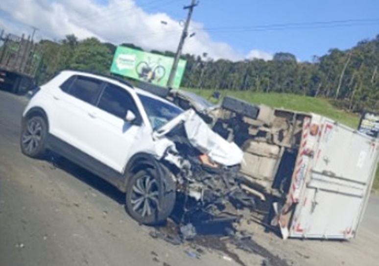 A colisão transversal envolveu os veículos T Cross e um caminhão. Com o impacto, o caminhão tombou sobre a pista. As equipes do Serviço de Atendimento Móvel de Urgência (SAMU) e de socorristas de Rio Azul prestaram atendimento aos ocupantes dos veículos.