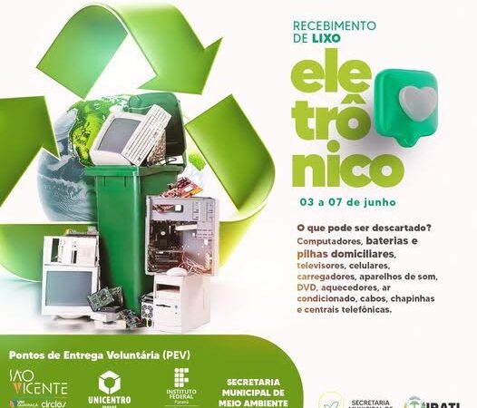 Uma campanha de coleta de lixo eletrônico está acontecendo em Irati. Os pontos de entrega dos produtos são a secretaria de Meio Ambiente de Irati, que fica na Avenida Vicente Machado, o Campus do Instituto Federal do Paraná (IFPR), na Vila Matilde, o Campus Irati da Unicentro, no bairro Engenheiro Gutierrez, e o Colégio São Vicente, na rua 24 de maio, no centro de Irati. Os materiais podem ser levados nesses locais até amanhã.