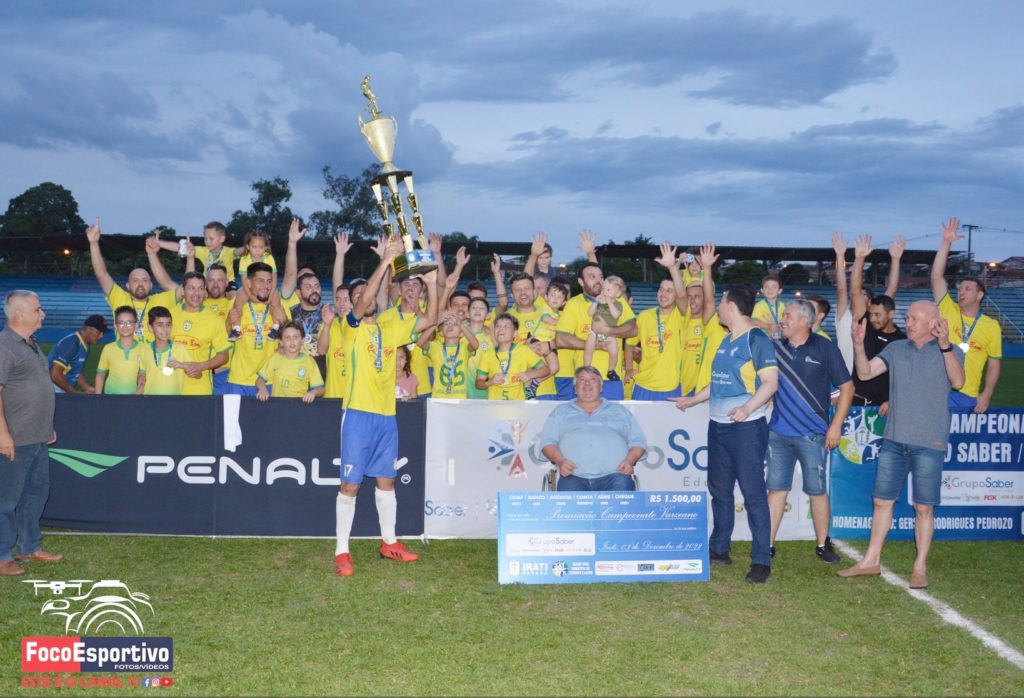 Mais Brasil foi campeão pela oitava vez do Campeonato Varzeano de Irati em 2022. Na imagem, Erick capitão do time ergue a taça de campeão após vitória por 2 a 1 sobre o Atlético da Serra/Lagoa, na decisão. Foto: Osmair Turko/Foco Esportivo/Arquivo