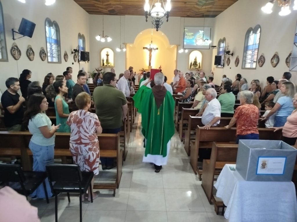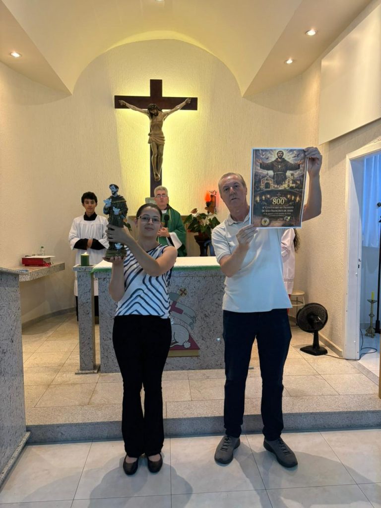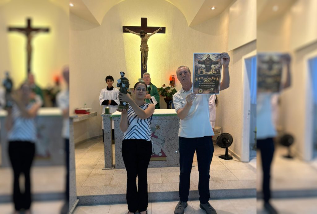 Já a imagem comemorativa e o cartaz alusivo presentes na celebração do último sábado foram conduzidos até o altar pelos ministros da Ordem Franciscana Secular (OFS) de Irati, Vanderlei Kawa e Denize Zapotowski, em um gesto simbólico que marcou o início das celebrações jubilares na comunidade.