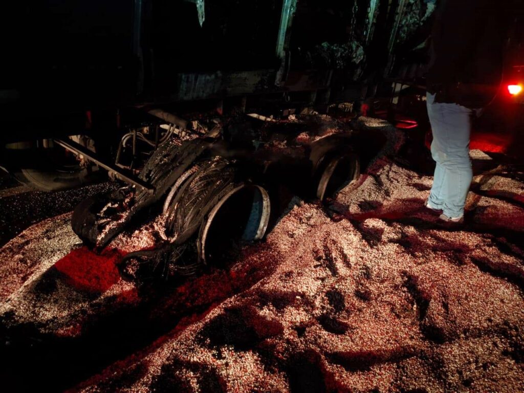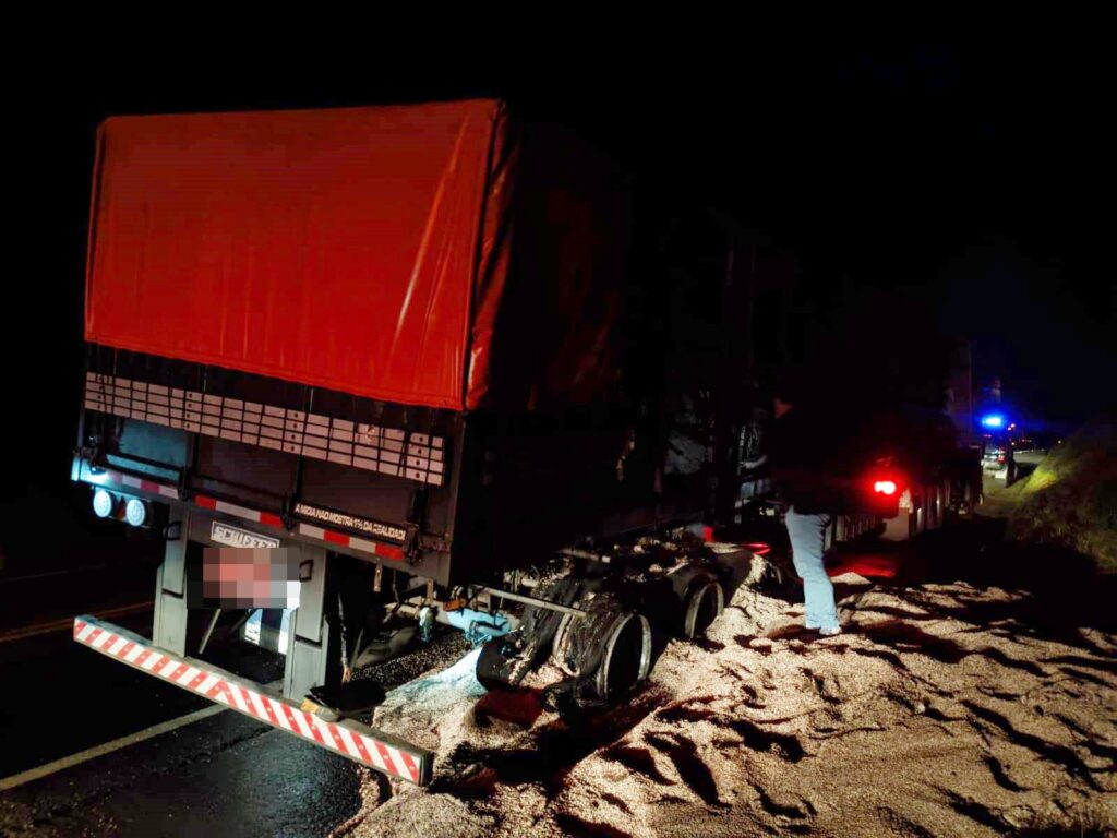 Uma carreta carregada com adubo orgânico pegou fogo na BR-373, em Guamiranga, na madrugada de hoje. O incidente ocorreu no quilômetro 246 da rodovia, no sentido Guamiranga/Prudentópolis.