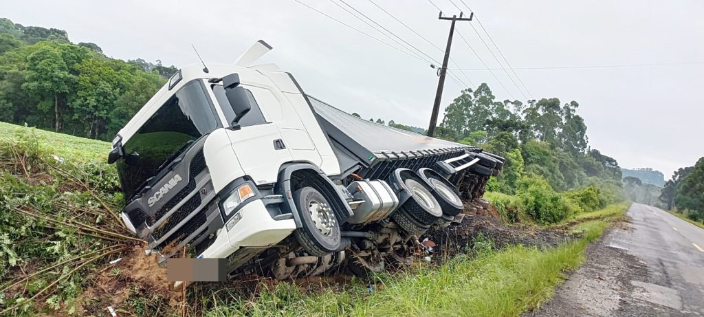 Uma carreta Scania carregada de celulose saiu da pista da BR 153, na altura do km 374, na localidade de Serro Azul, entre os municípios de Rio Azul e Mallet. O fato ocorreu na noite desta terça-feira, 27, por volta das 21h30min. Chovia muito no momento do acidente. O motorista não se feriu.