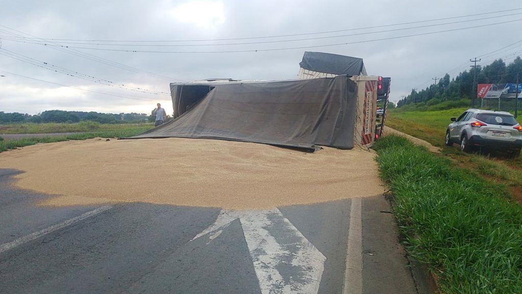 Uma carreta tombou e espalhou uma carga de soja na altura do km 503 da rodovia BR 376, em Ponta Grossa, na manhã desta quarta-feira, 27.