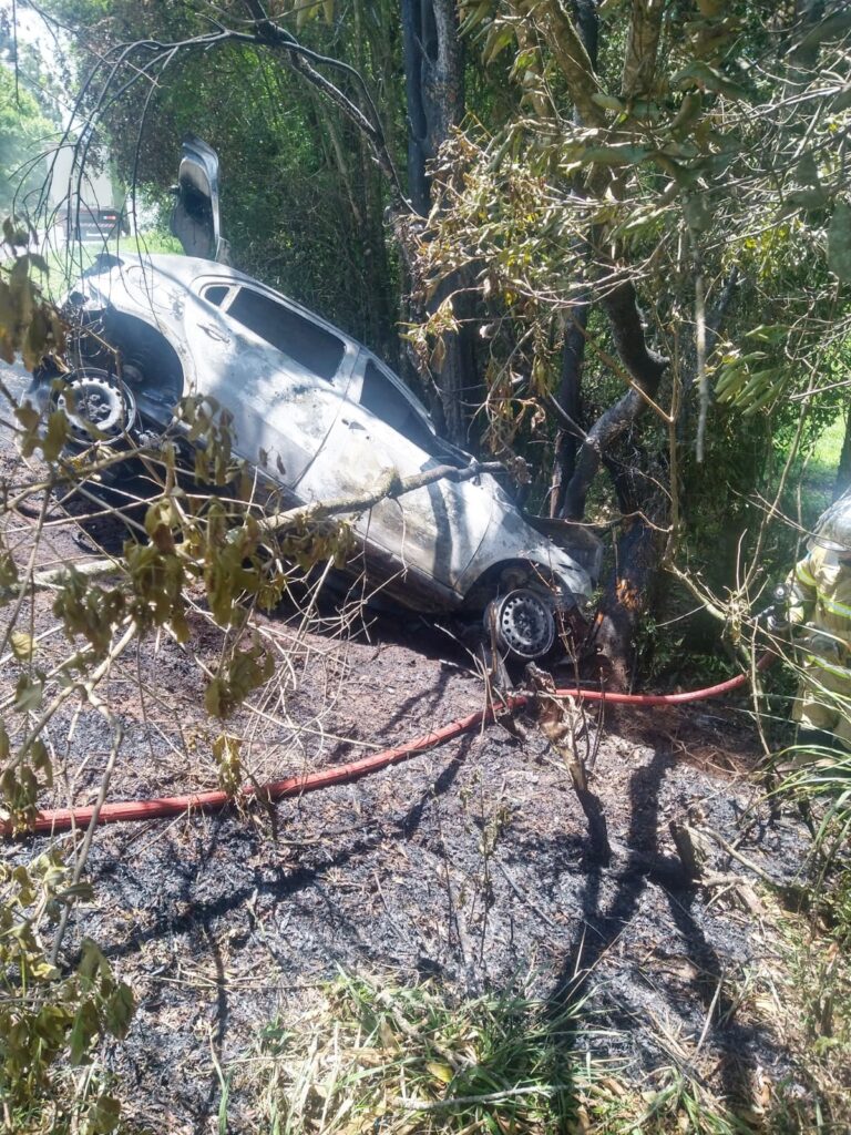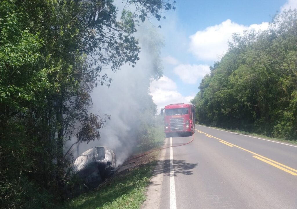 Um veículo Volkswagen Novo Gol ficou destruído após pegar fogo na PR-438, em Fernandes Pinheiro, no fim da manhã de hoje. O incêndio ocorreu após o condutor perder o controle da direção, sair da pista e colidir contra uma árvore.