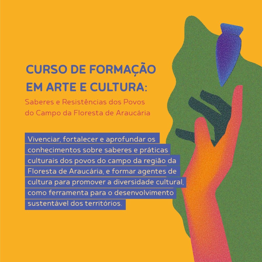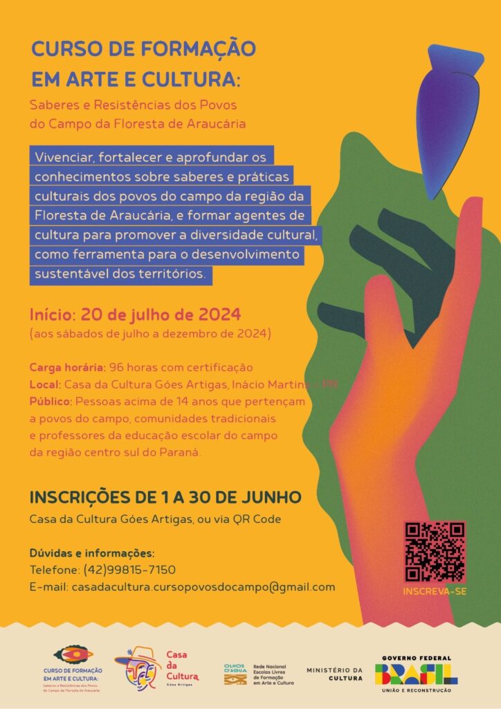 A Casa da Cultura de Góes Artigas, em Inácio Martins, vai oferecer o Curso de Formação em Arte e Cultura “Saberes e Resistências dos Povos do Campo da Floresta de Araucária”. Com carga horária de 96 horas e aulas aos sábados, de julho a dezembro, o curso é voltado para pessoas acima de 14 anos, que pertençam aos povos do campo, comunidades tradicionais e para professores da educação escolar do campo na região Centro-Sul do Paraná. As inscrições estão abertas até hoje (dia 30 de junho).