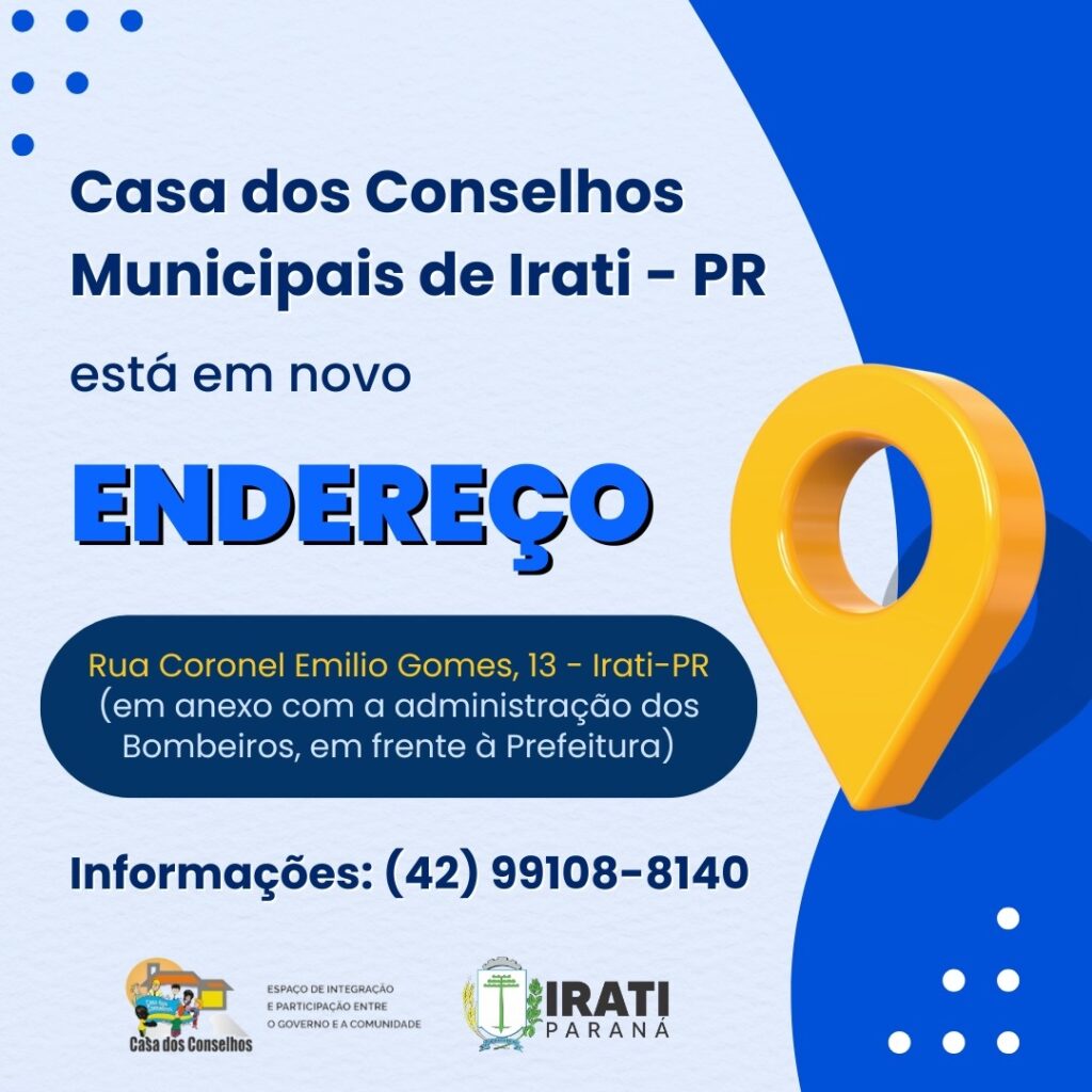 A Casa dos Conselhos Municipais de Irati está atendendo em um novo endereço. O espaço fica na rua Coronel Emílio Gomes, número 13, no centro da cidade, em anexo ao setor administrativo dos bombeiros e em frente à Prefeitura. Até o ano passado, a Casa dos Conselhos funcionava na rua Coronel Pires, nos fundos do prédio do Centro Administrativo Municipal (CAM).