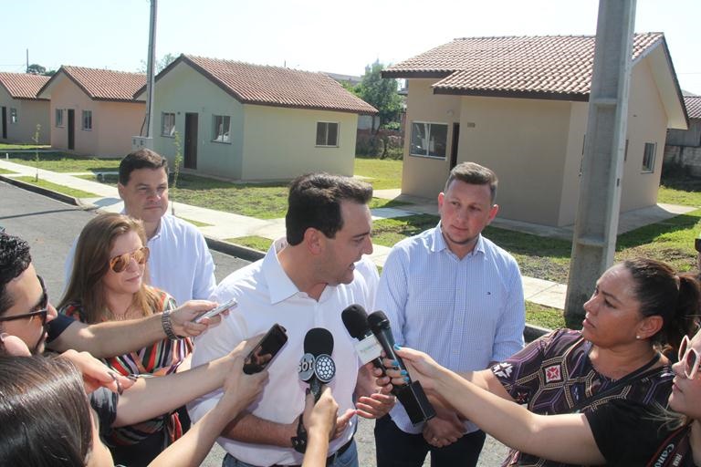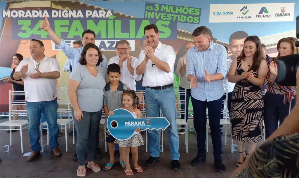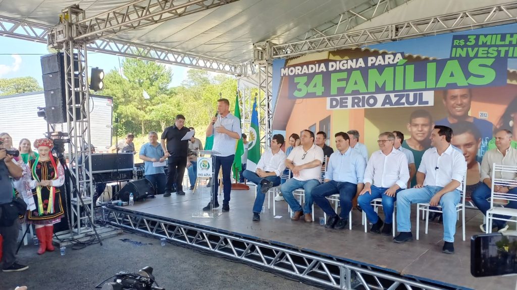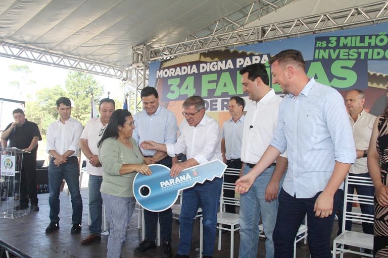 Durante a entrega das casas em Rio Azul, Ratinho Junior destacou que o estado possui um dos maiores programas habitacionais do País. “Hoje, nós, paranaenses, temos o orgulho de ter o maior programa de construção de casa própria do Brasil. Nós estamos construindo e entregando para população mais de 35 mil casas. Hoje, nós estamos aqui em Rio Azul, entregando para essas famílias são 34 casas. Essa é uma modalidade que nós criamos, que é um recurso, que é uma casa que é doada para as famílias mais humildes. Temos o programa Casa Fácil, onde nós damos a entrada para as pessoas. Entregamos essa semana, em Londrina, aproximadamente 800 casas num bairro planejado que também é uma outra maneira moderna de se fazer bairros, com esse programa Casa Fácil. Para nós, hoje é um dia de muita alegria, de festividade”, disse Ratinho Junior.