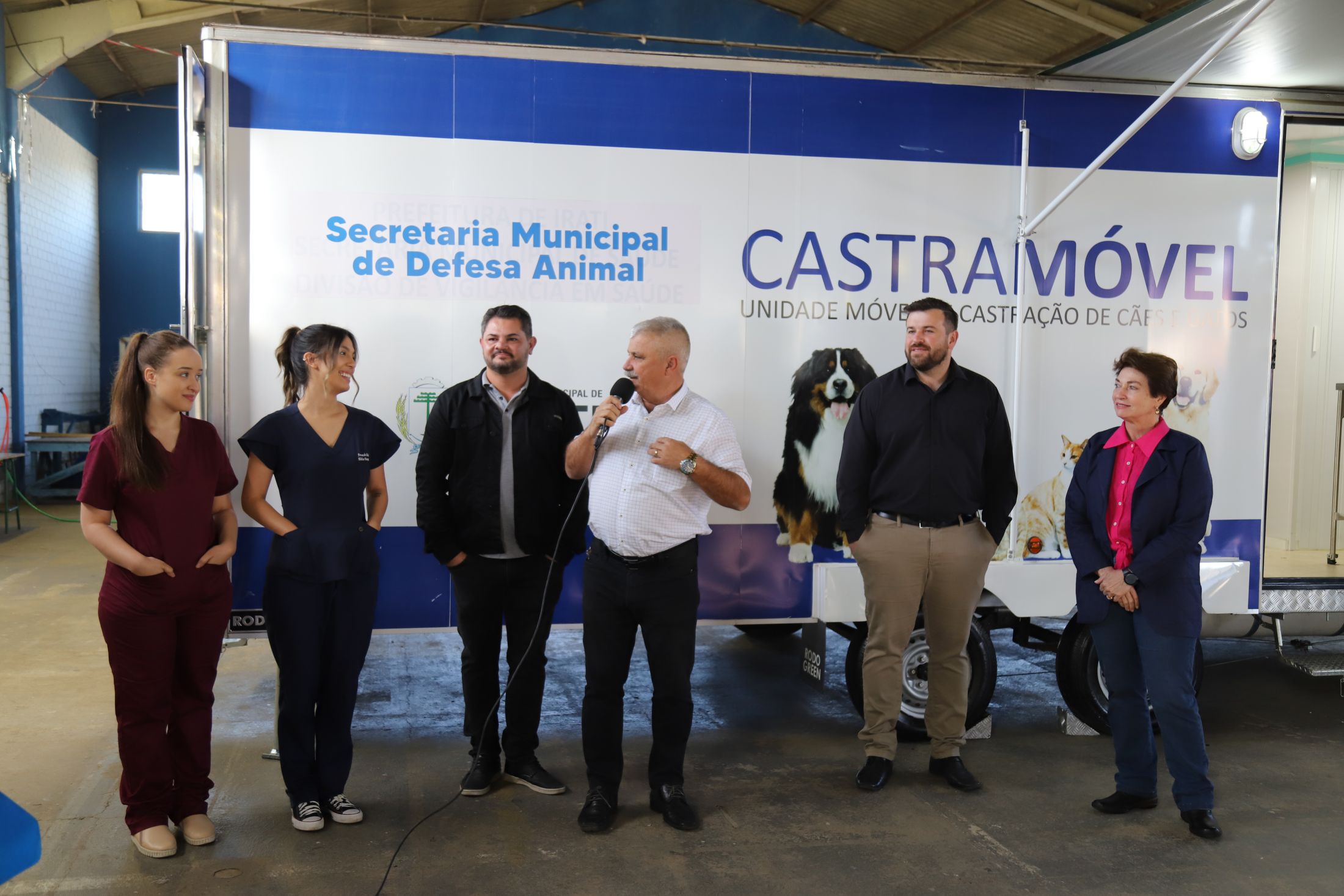 Castramóvel. Na foto: As médicas veterinárias Luana Burake e Fernanda Almeida, Secretário de Defesa Animal Wagner Beida, prefeito Jorge Derbli, diretor do Centro Universitário Campo Real Angelo Antonio Delponte e vice-prefeita Ieda Waydzik. Foto: Prefeitura de Irati