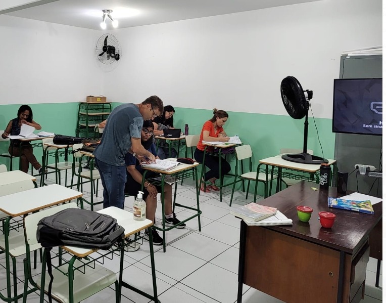 No Ensino Médio, a metodologia é dividida por meio de blocos de disciplinas, mas há diferença no presencial e no online. “A diferença no presencial e no online é que quando o aluno vai, vai encontrar a carga horária de 50 minutos ou uma hora, semelhante ao ensino regular, e ele vai ter acesso a todos os professores naquele dia que ele vai. Diferente do ensino presencial, que o horário é mais maciço, é mais cheio. O pessoal do Ensino Médio, do Ensino Fundamental, quando vão tirar algumas dúvidas a respeito do uso da plataforma, essas dúvidas existiram diretamente com a pedagoga ou com os professores que estão na escola”, conta o professor.