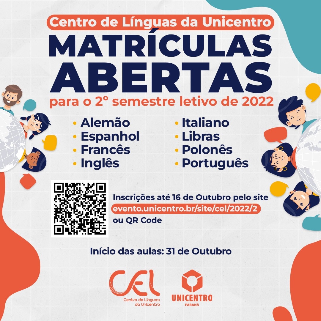 O Centro de Línguas da Universidade Estadual do Centro-Oeste do Paraná (Unicentro) está com inscrições abertas para os cursos de língua estrangeira que serão ofertados no segundo semestre. São 26 opções de cursos distribuídos em oito línguas (Alemão, Espanhol, Francês, Inglês, Italiano, Libras, Polonês e Português).